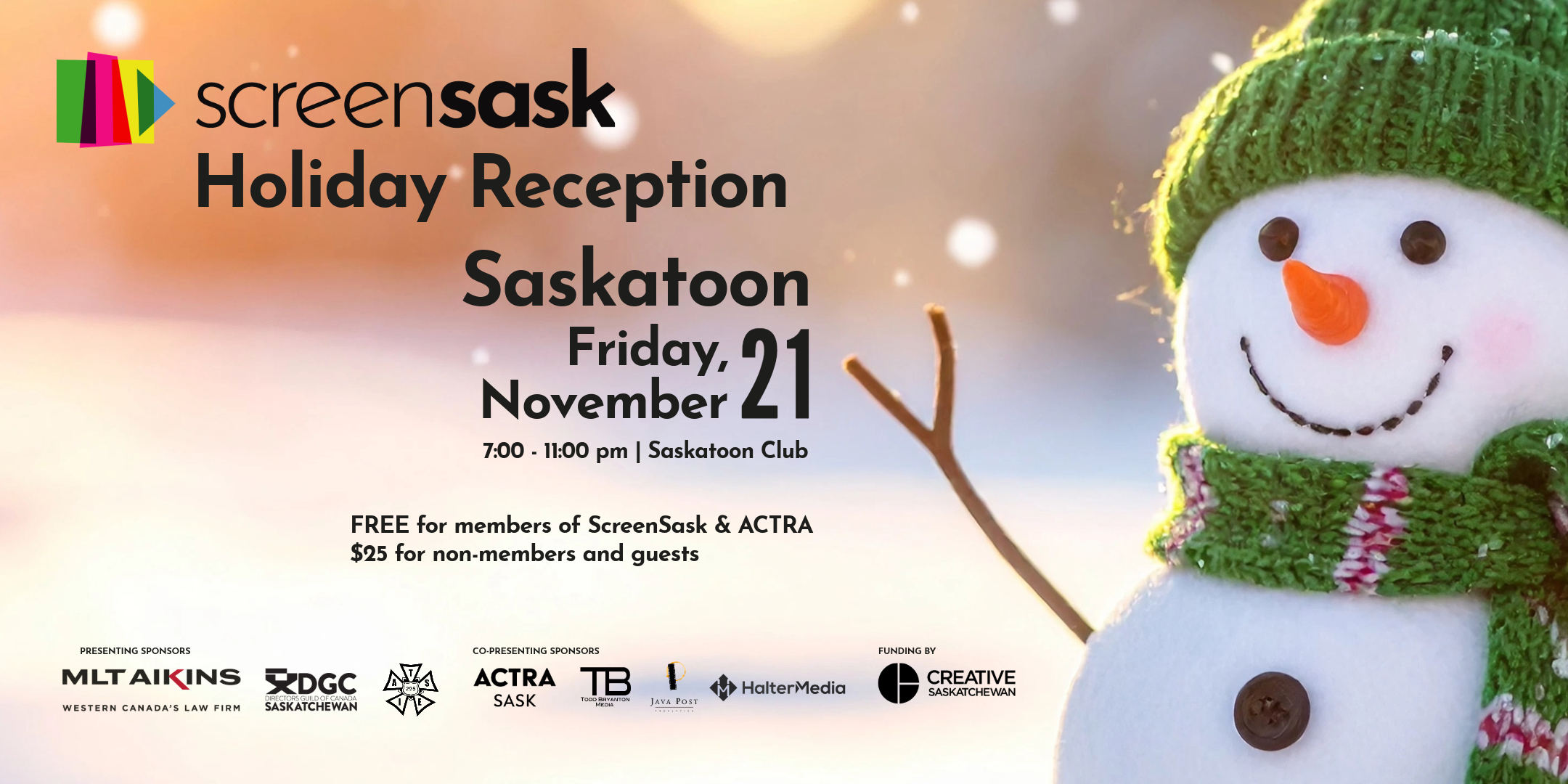 *If you are not a member of ScreenSask and would like to be, the price is only $25/year for students, employees of Corporate Member companies and members of ACTRA, IATSE 295, IATSE 300, ICG 699 and DGC. Visit www.screensask.com to join before registering for your holiday reception ticket.